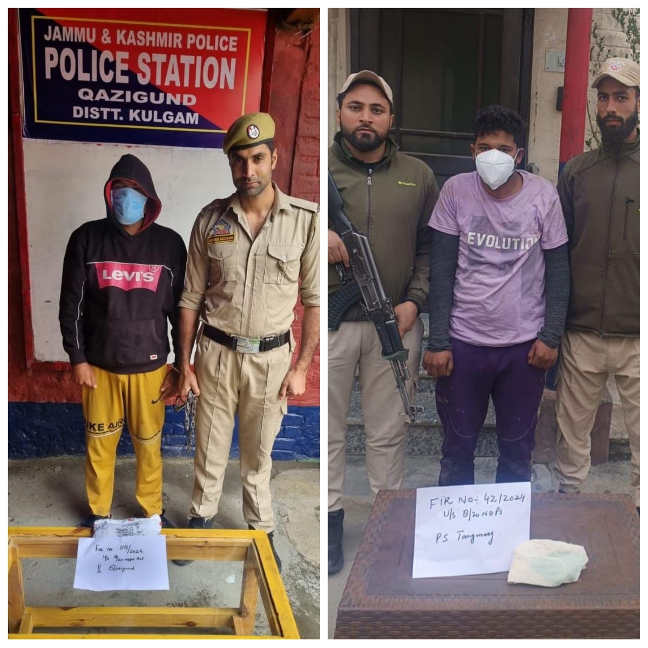 April 21: Continuing its unwavering efforts to eradicate the menace of drugs from the society, Police have arrested 02 drug peddlers in Kulgam & Baramulla and recovered contraband substance from their possession.