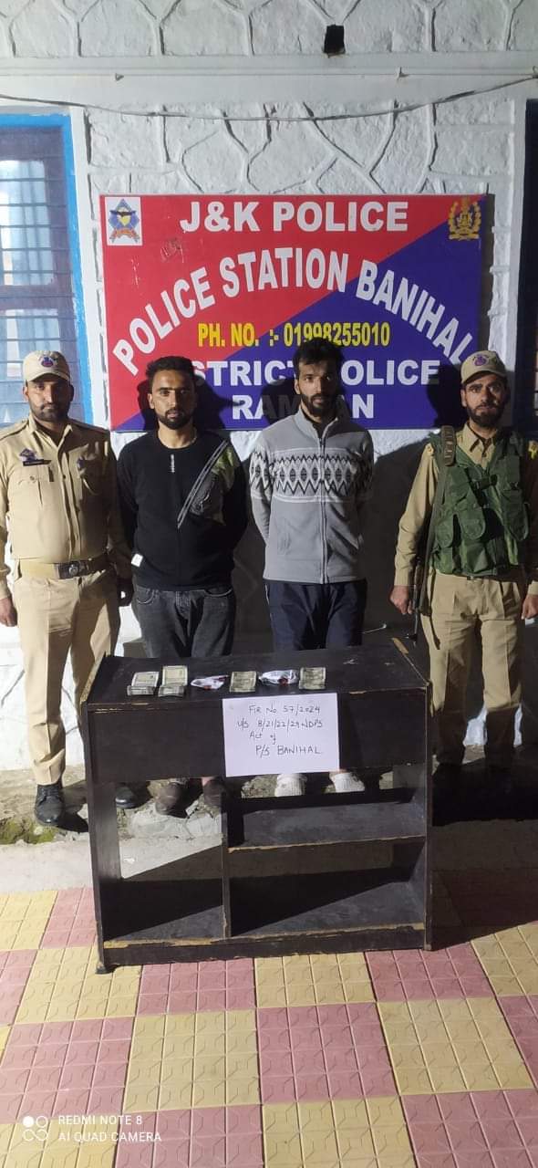 Two individuals were apprehended with a significant quantity of a substance resembling heroin, along with a cash amount of one lakh seventy-six thousand rupees.The incident unfolded during routine vehicle and pedestrian checks at T-Chowk naka in Banihal. Two pedestrians, coming from the Banihal Railway Station and heading towards the Banihal market, attempted to evade the police checkpoint upon sighting the naka party. However, they were swiftly apprehended after a determined effort by the naka party. Upon inquiry, one individual was identified as Yasir Ahmed Karoo son of Nazar Ahmed resident of Qazi Molalla Tehsil and District Anantnag, and Abid Ahmed Bhat son of Mohd Ashraf Bhat resident of Lalchowk Tehsil and District Anantnag. From their possession, a substance resembling heroin and a cash amount of Rupees one lakh seventy-six thousand were recovered.
