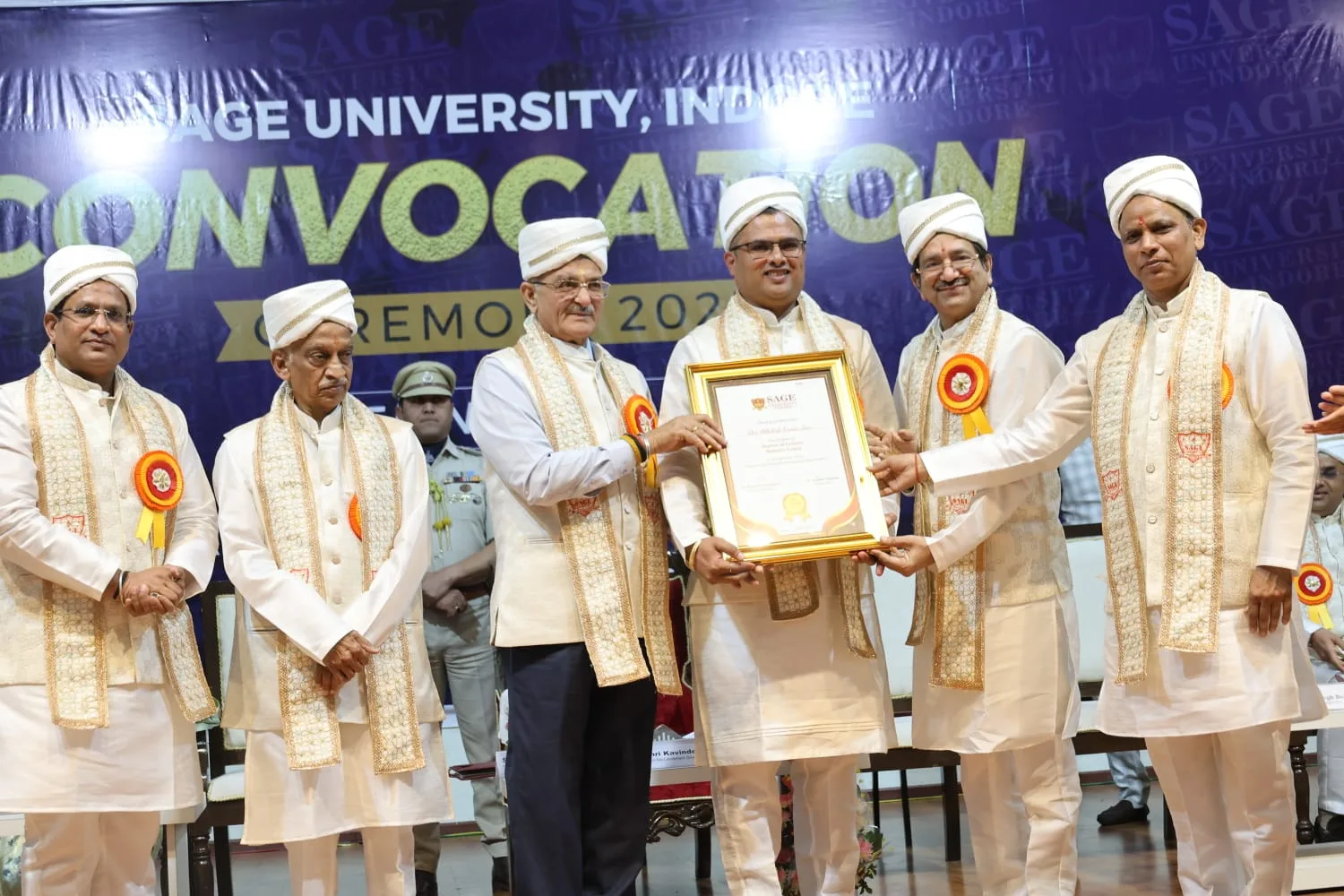 The convocation was attended by Shri A.S. Kiran Kumar, Padma Shri Awardee & Chairman Space Commission, Government of India; Shri Khem Singh Daheriya, Chairman, MPPURC; Smt Anuradha Paudwal, Padma Shri Awardee & Playback Singer and Politician; Er. Sage Sanjeev Agrawal, Chancellor, SAGE University, Indore, Dr. Ankur Arun Kulkarni, Vice Chancellor, SAGE University, Indore; Dr. Sudhir Agrawal, Director General, SAGE University; Dr. Manish Choudhary, Registrar; Mr. Rajni A Patel, Chairman and Managing Director, Balaji JMC Paper Mills; Mr. Sanjeev Agrawal; Urolbek Normuratov, Renowned Educationist from Uzbekistan and Mr. Akhilesh Kumar Jain, International textile technocrat. (JKNS)