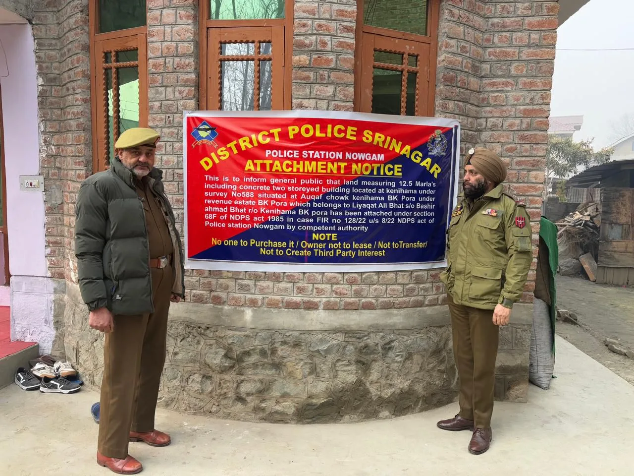 In a statement police spokepserson as per news agency JKNS said, In a significant action against the drug menace, Srinagar Police have attached a double-storey residential house along with 12.5 marlas of land, valued at approximately ₹1.6 crore, belonging to a notorious drug peddler.