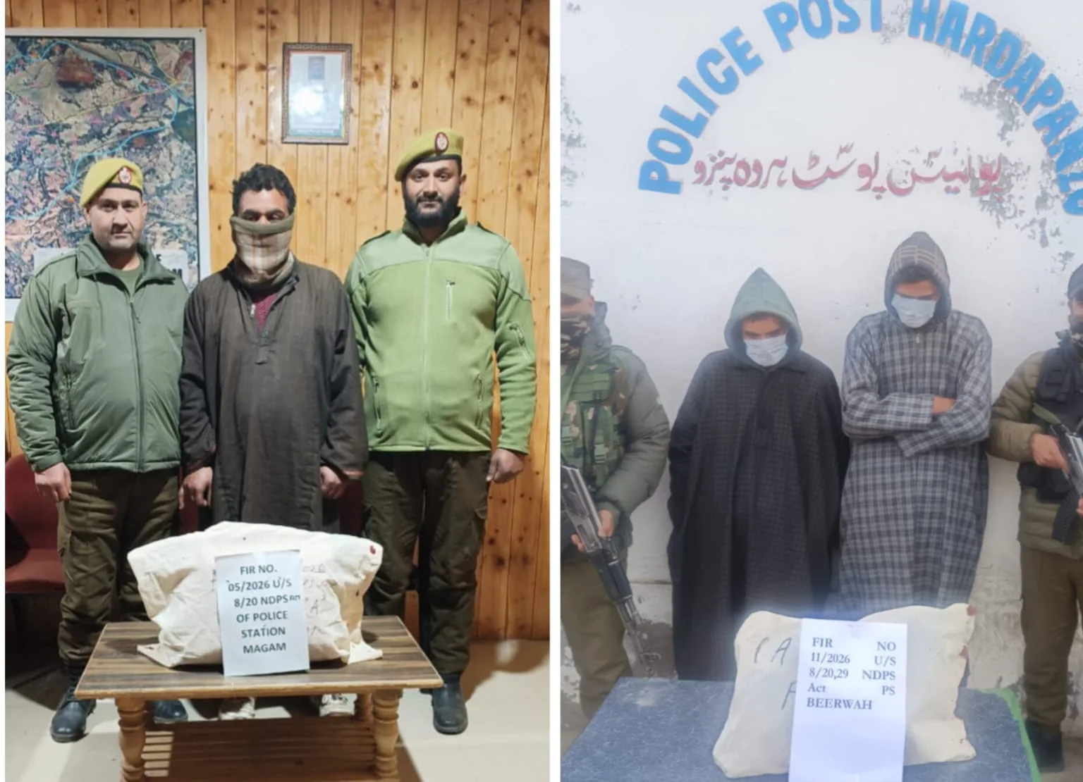 In a separate operation, a police team from Police Post Hardpanzoo, led by SI Ghulam Mohammad, established a checkpoint at village Bonizanigam. During the checking, two individuals carrying a nylon bag were noticed behaving suspiciously and attempted to flee. They were tactfully apprehended by the police party. The accused were identified as Irfan Ahmad Mir, son of Mohd Yousuf Mir, and Owais Ahmad Bhat, son of Gh Mohd Bhat, both residents of village Hardulatina. Upon search, 2 kg and 185 grams of ground charas-like substance were recovered from their possession. Consequently, FIR No. 11/2026 under Sections 8/20 and 29 of the NDPS Act has been registered at Police Station Beerwah, and investigation has been initiated, it resds
