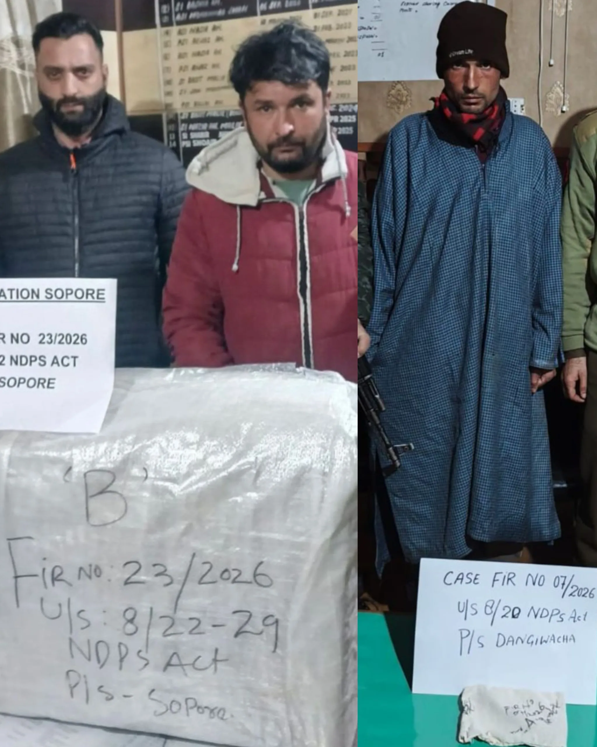 In a statement issued here to news agency JKNS, During the investigation of Case FIR No. 23/2026 registered under Sections 8/22–29 of the NDPS Act and Section 281 BNS at Police Station Sopore, based on the disclosure of the earlier arrested accused, Sopore Police apprehended two more persons namely Mohd Umar Dar, S/O Ghulam Nabi Dar, and Nisar Ahmad Bhat @ Shanu, S/O Mehraj-ud-Din Bhat, both residents of Naseem Bagh, Sopore.