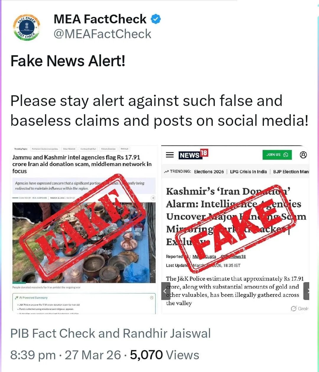 Srinagar, Mar 27 (JKNS): The Ministry of External Affairs (MEA) Fact Check unit has dismissed as fake certain reports circulating on social media and news platforms regarding an alleged Iran donation scam in Jammu and Kashmir.