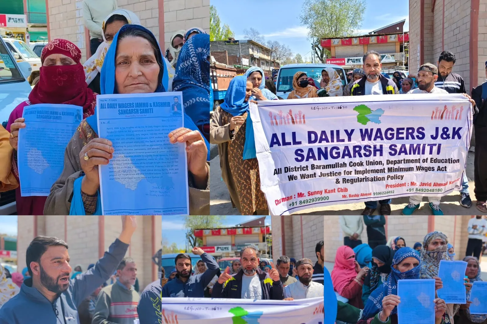 Budgam, Apr 13 (JKNS): Scores of cooks associated with the Department of Education staged a protest in Beerwah on Monday under the banner of the All Daily Wagers J&K Sangarsh Samiti, demanding the implementation of minimum wages and regularisation of their services.