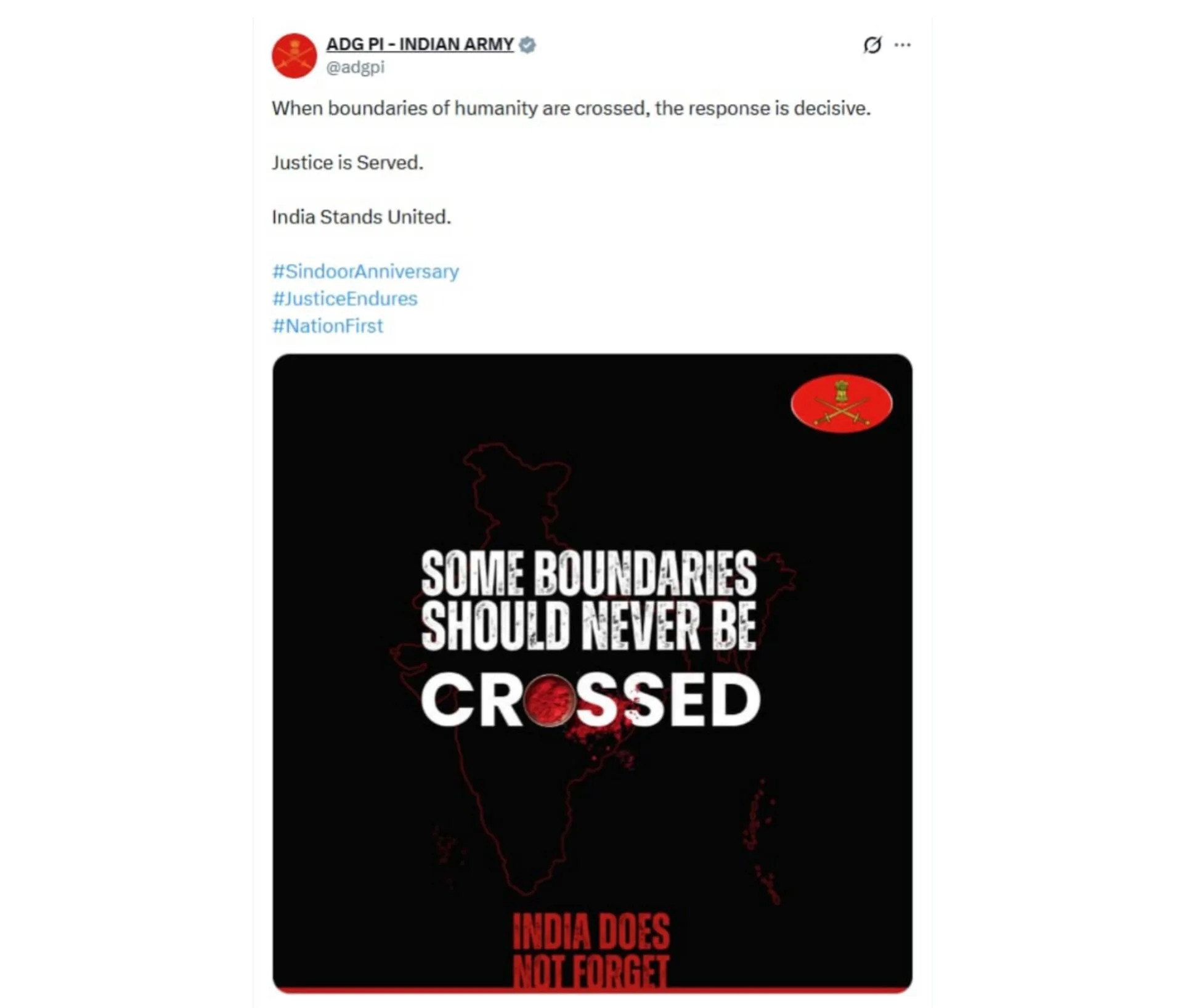 In the post as per news agency JKNS, ADG PI wrote, “When boundaries of humanity are crossed, the response is decisive. Justice is served. India stands united.”