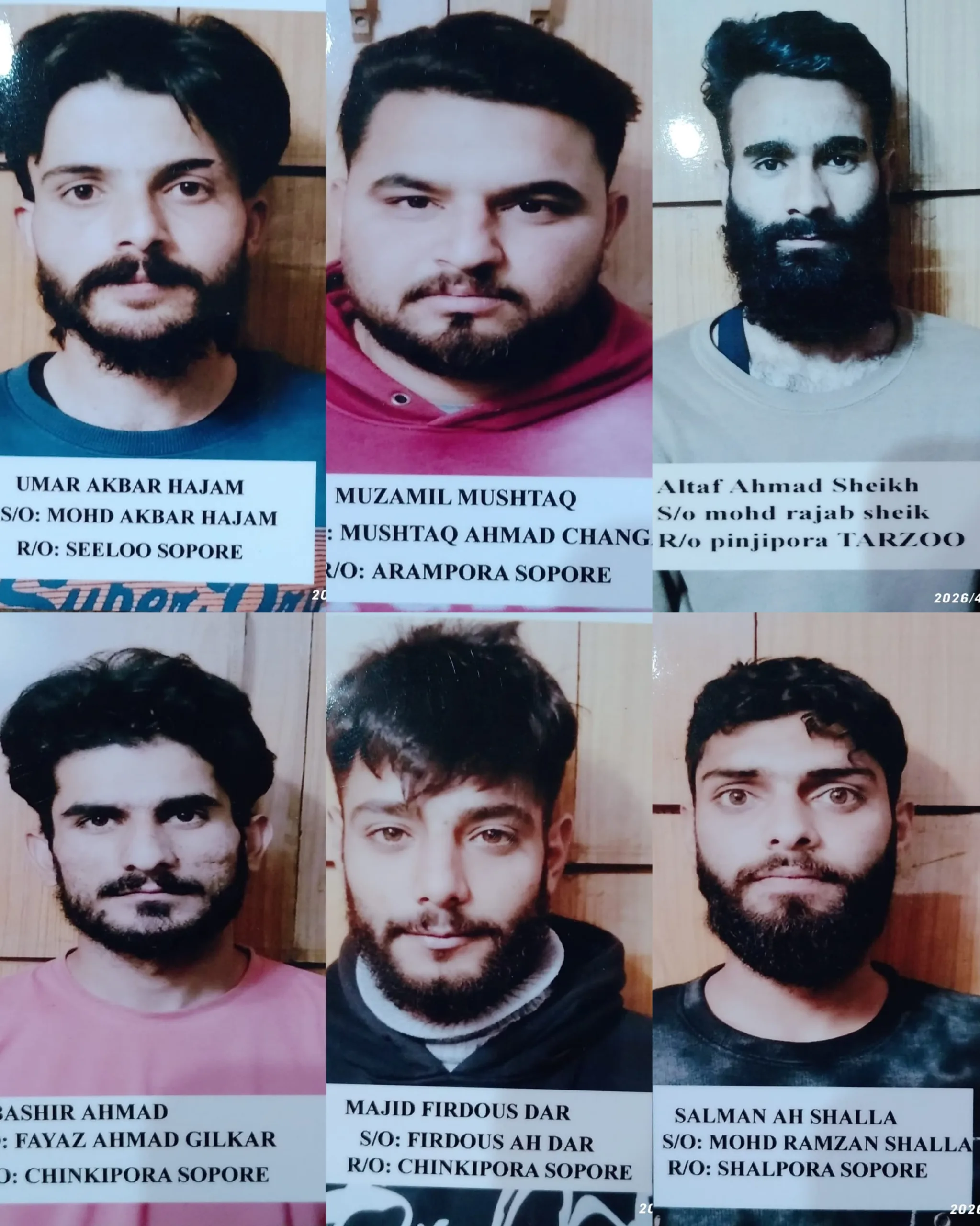In a statement police as per news agency JKNS said, The individuals have been identified as, Umar Akbar Hajam, S/O Mohammad Akbar, R/O Seelu and Salman Ahmed Shala, S/O Mohammad Ramzan Shala, R/O Shalpora Sopore and Altaf Ahmed Sheikh, S/O Mohammad Rajab Sheikh, R/O Panzipora Tarzoo and Mubashir Ahmed Gilkar, S/O Fayaz Ahmed Gilkar, R/O Naseerabad Sopore and Muzammil Mushtaq Changa, S/O Mushtaq Ahmed Changa, R/O Arampora Sopore and Majid Firdous Dar, S/O Firdous Ahmed Dar, R/O Chinkipora Sopore.