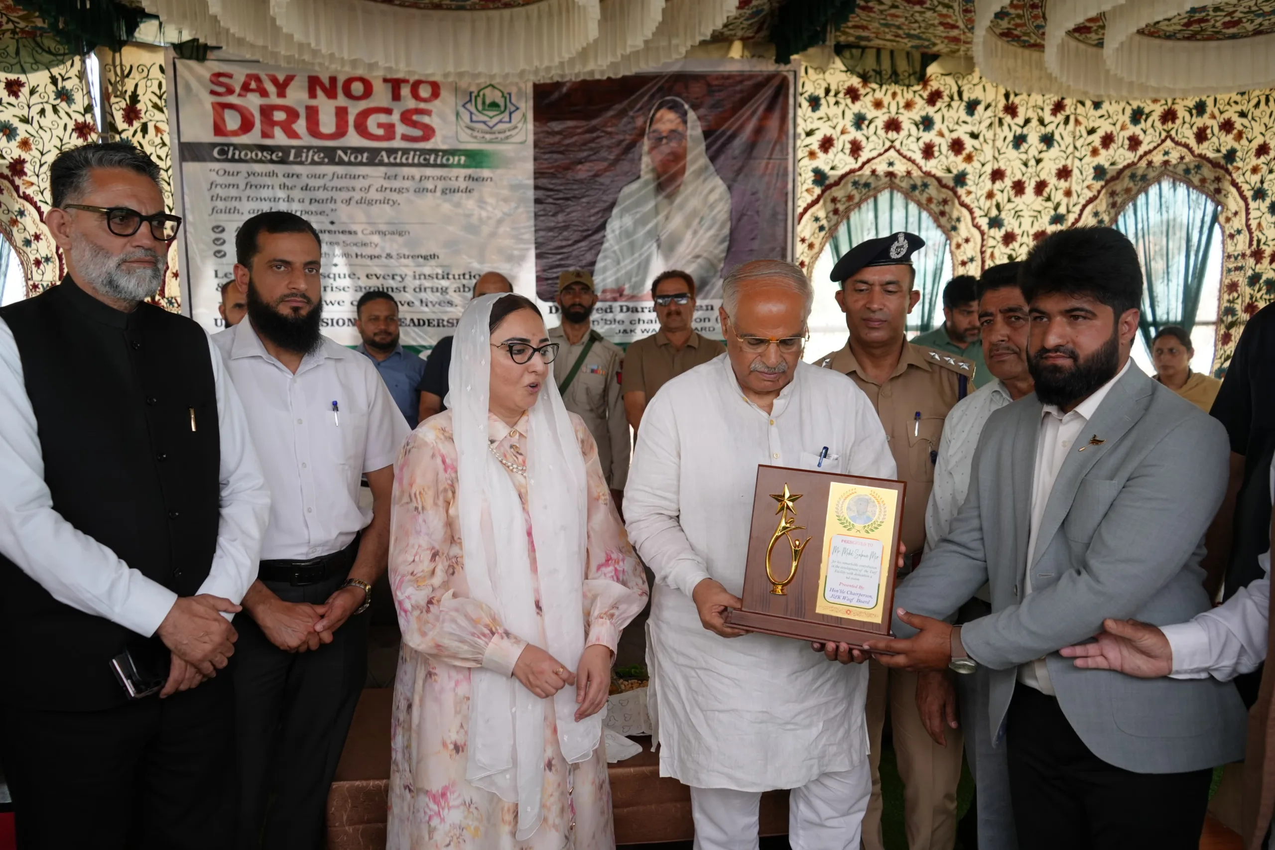 She later laid foundation stone for the Guest House to be constructed by the Board in the town. Accompanied by Shri Ashok Koul Ji and others Dr Andrabi deliberated on the Nasha Mukti Abhiyaan initiated by the Board throughout J&K.